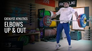 Pull your elbows up and out as you pick your feet up to accelerate yourself down into a squat, squeeze back to turn the bar over while keeping it close, and punch up into a forceful lockout in the overhead position.